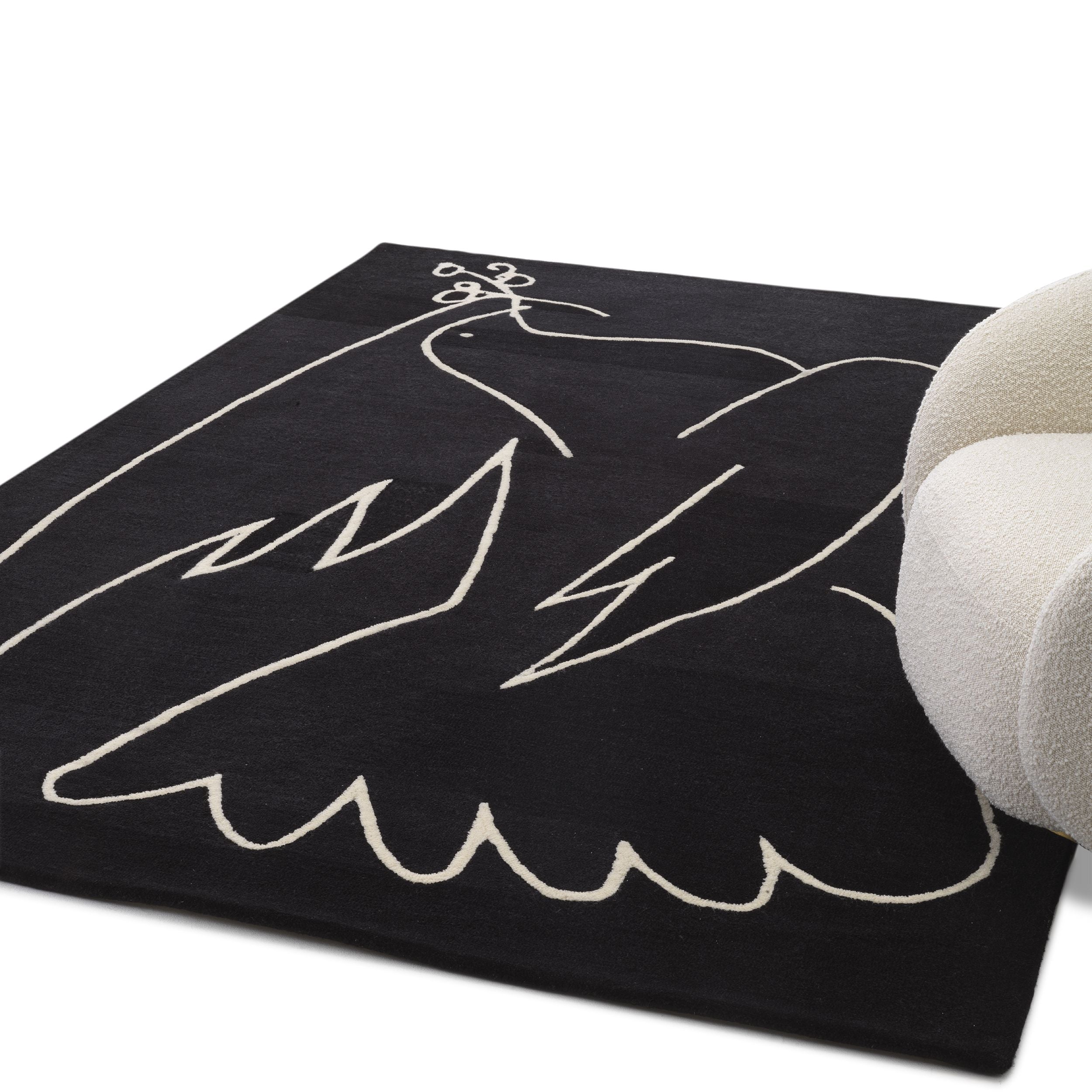 Ręcznie tuftowany z wełny nowozelandzkiej, czarno-biały dywan Piccione przedstawia białego gołębia z gałązką oliwną w dziobie, znanego również jako gołąb pokoju, jeden z najbardziej rozpoznawalnych symboli harmonii na świecie. Nie ma lepszego wzoru do stworzenia przyjaznej atmosfery w domu niż ten!