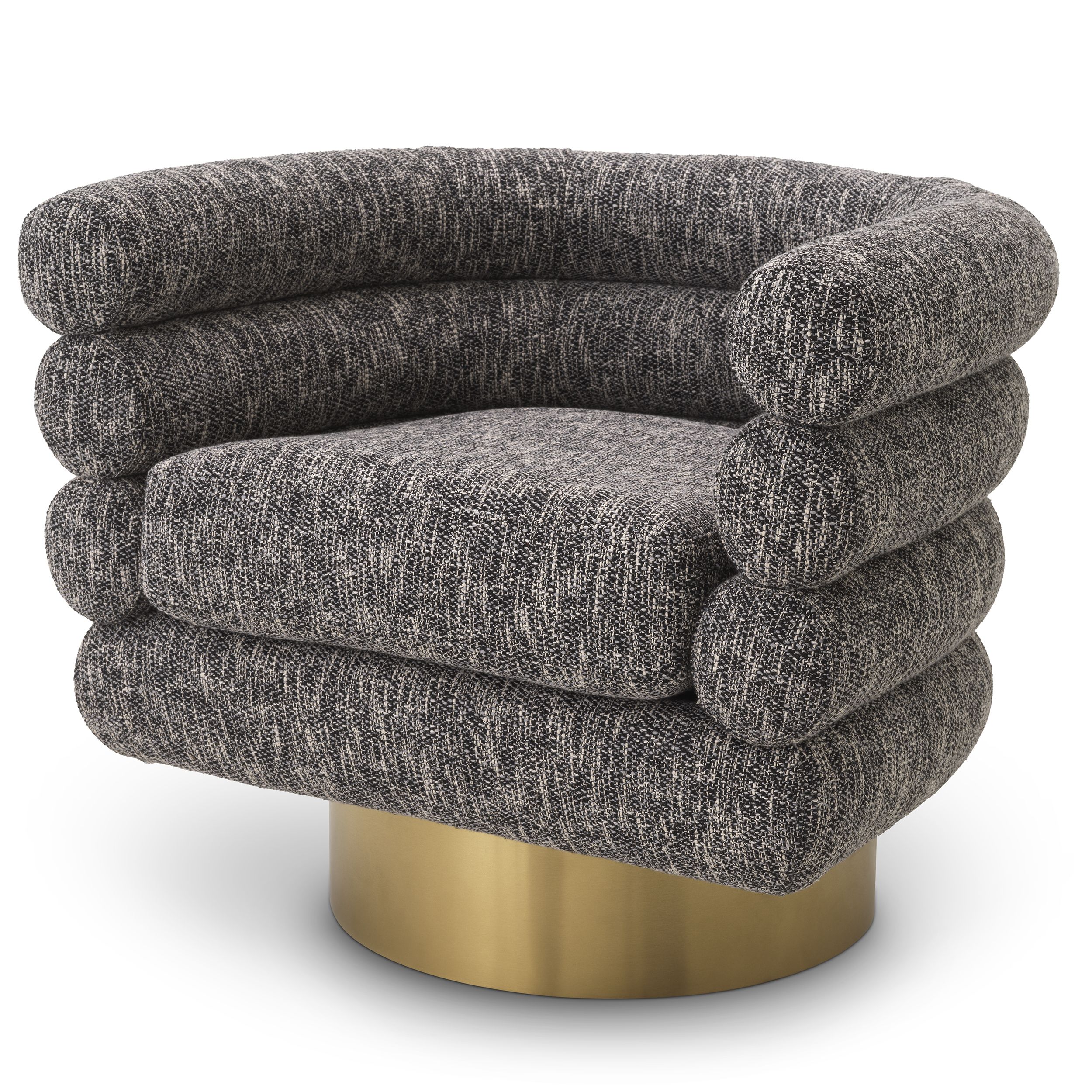 Niezwykła sylwetka krzesła obrotowego Maguire wywodzi się z Streamline Moderne, międzynarodowego stylu Art Deco z lat 30., charakteryzującego się zaokrąglonymi formami i długimi poziomymi liniami. Maguire łączy obrotową podstawę ze szczotkowanego mosiądzu z luksusową tapicerką.