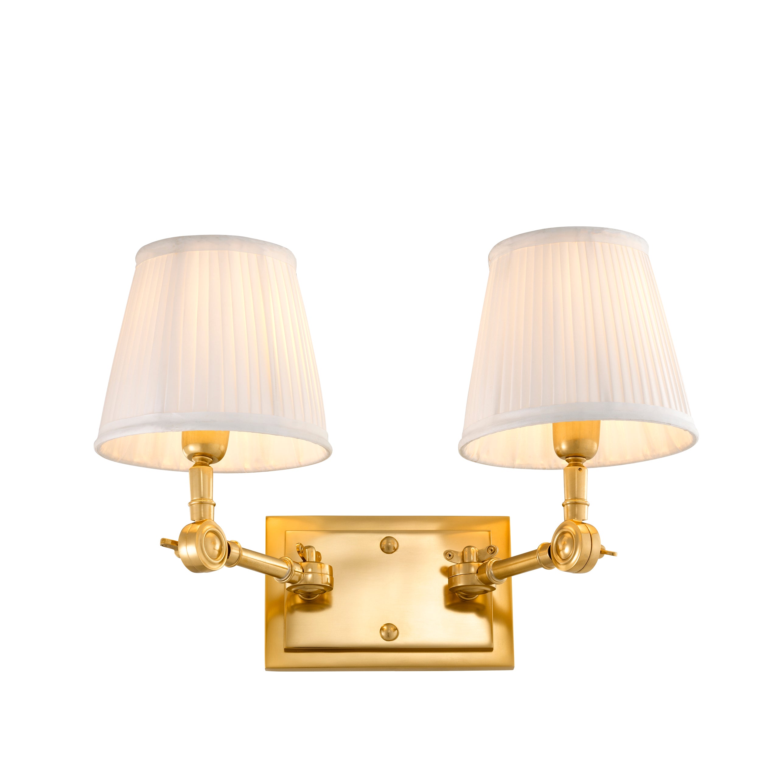 Zaproś elegancję butikowego hotelu do swojego wnętrza dzięki podwójnej lampie ściennej Wentworth. Zainspirowana klasycznymi lampami ściennymi, ta mosiężna oprawa w stylu vintage posiada dwa regulowane ramiona i dwa plisowane czarne abażury. Klosze mogą być używane na dwa sposoby, w zależności od położenia ramion. Obrócone w górę, klosze można zamontować od dołu. Obrócone w dół mogą być montowane od góry.