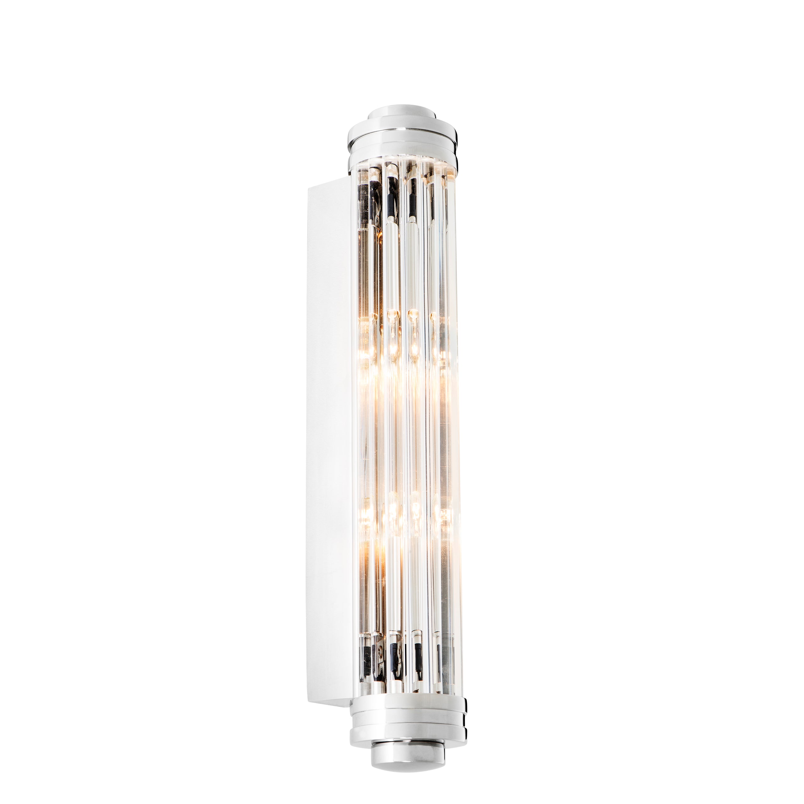 Kinkiet ścienny Gascogne S z kloszem z żebrowanego i fazowanego przezroczystego szkła skąpie wnętrze w miękkim i ciepłym blasku. Zainspirowany lampami teatralnymi w stylu Art Deco, ten kuszący kinkiet doda kosmopolitycznego stylu i blasku Twojemu domowemu wystrojowi.