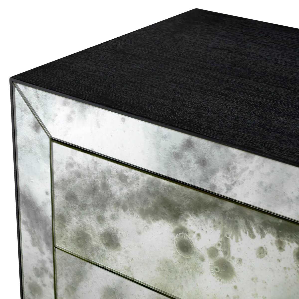 Odkryj wyrafinowany urok szafki nocnej Eichholtz Bogart, wyjątkowego mebla, który łączy grafitowy fornir dębowy z wykończeniem z antycznego szkła lustrzanego.