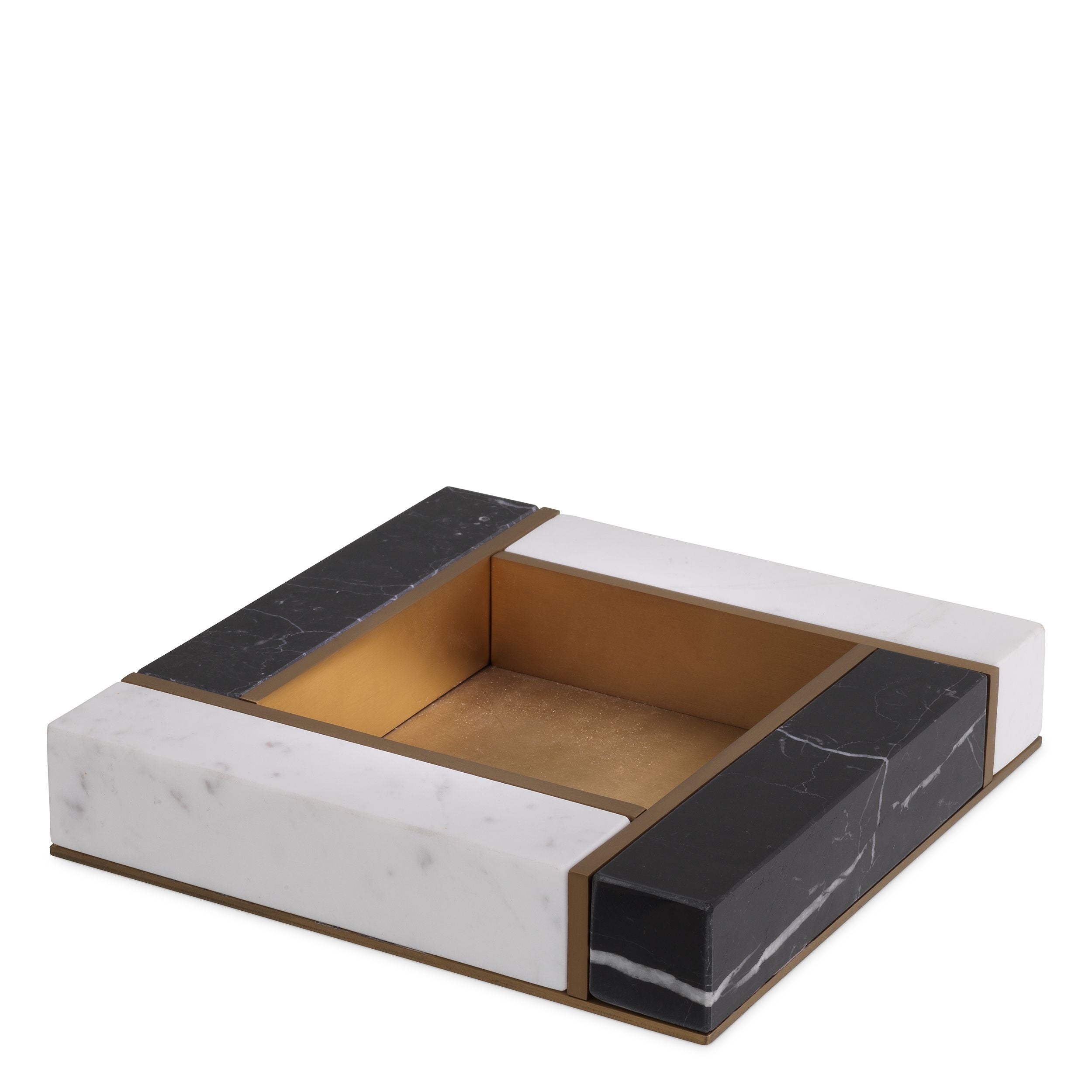 Prawdopodobnie najbardziej elegancka taca, jaką kiedykolwiek widziałeś, mała taca Farrell szczyci się luksusową powierzchnią wykończoną antycznym mosiądzem i podniesionymi krawędziami, które są inkrustowane białym i czarnym marmurem. Ten dekoracyjny element jest prawdziwą ozdobą.