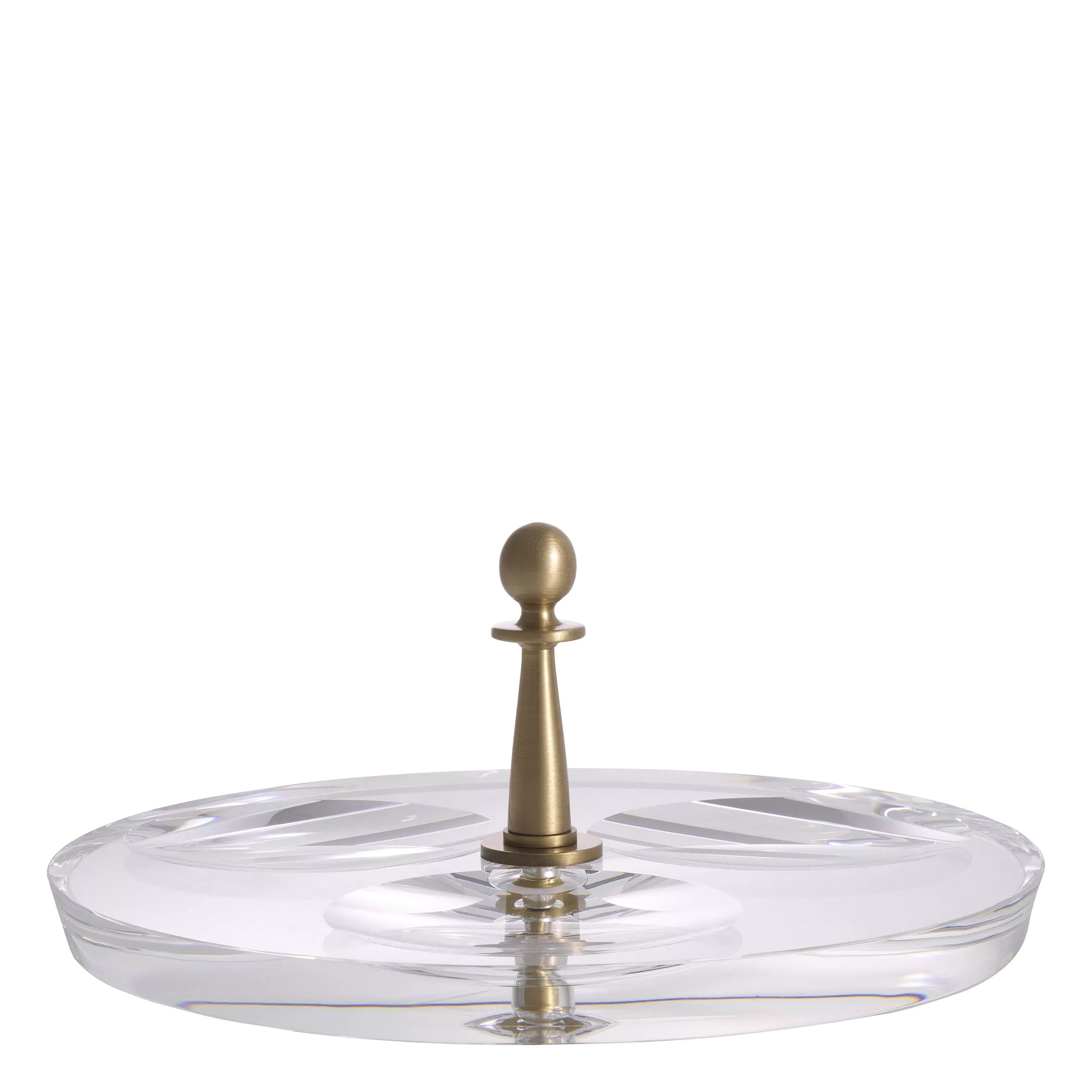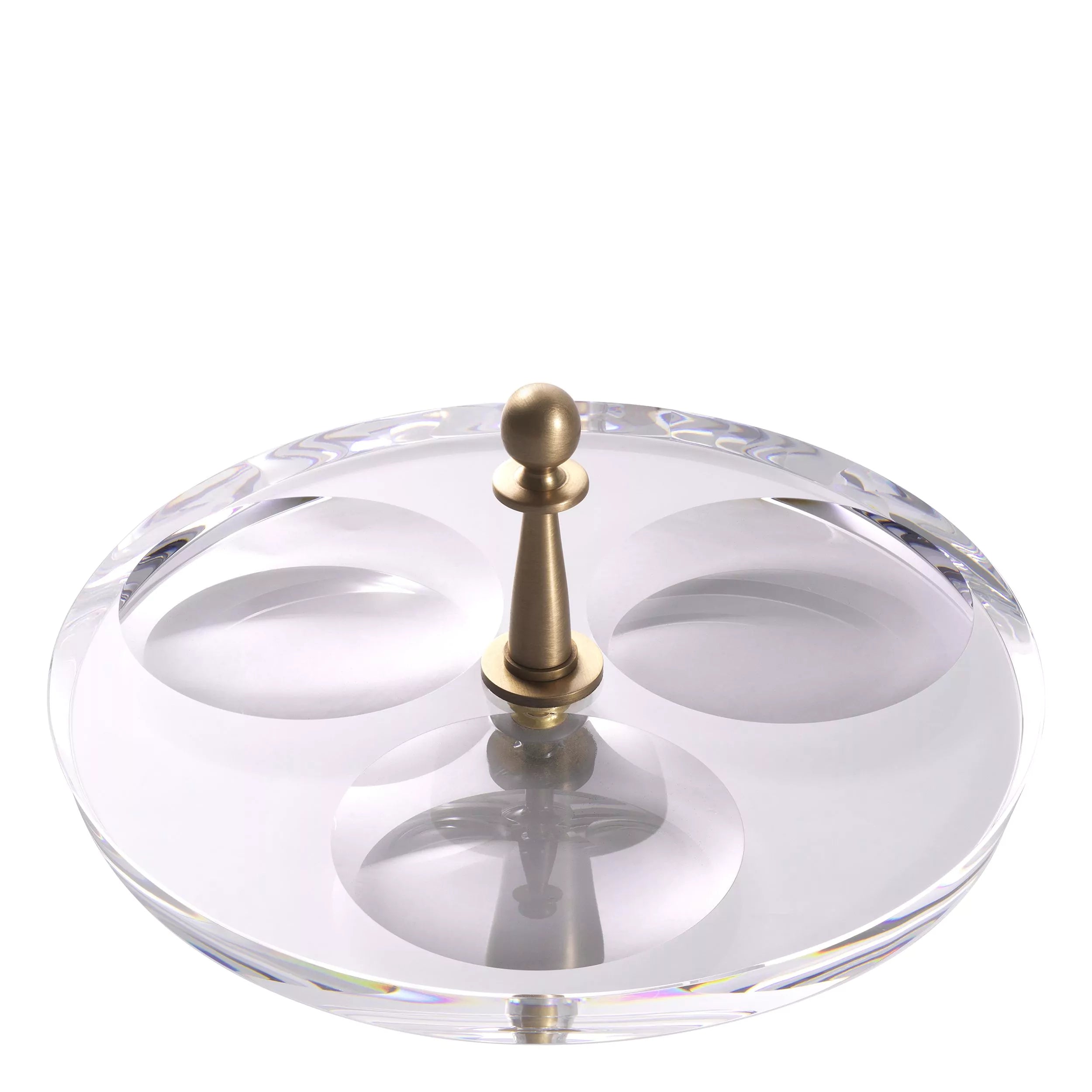 Wykonana z litego, przezroczystego szkła taca Krone ma trzy przegródki w kształcie misy i antyczny mosiężny uchwyt do podnoszenia ze zwieńczeniem.