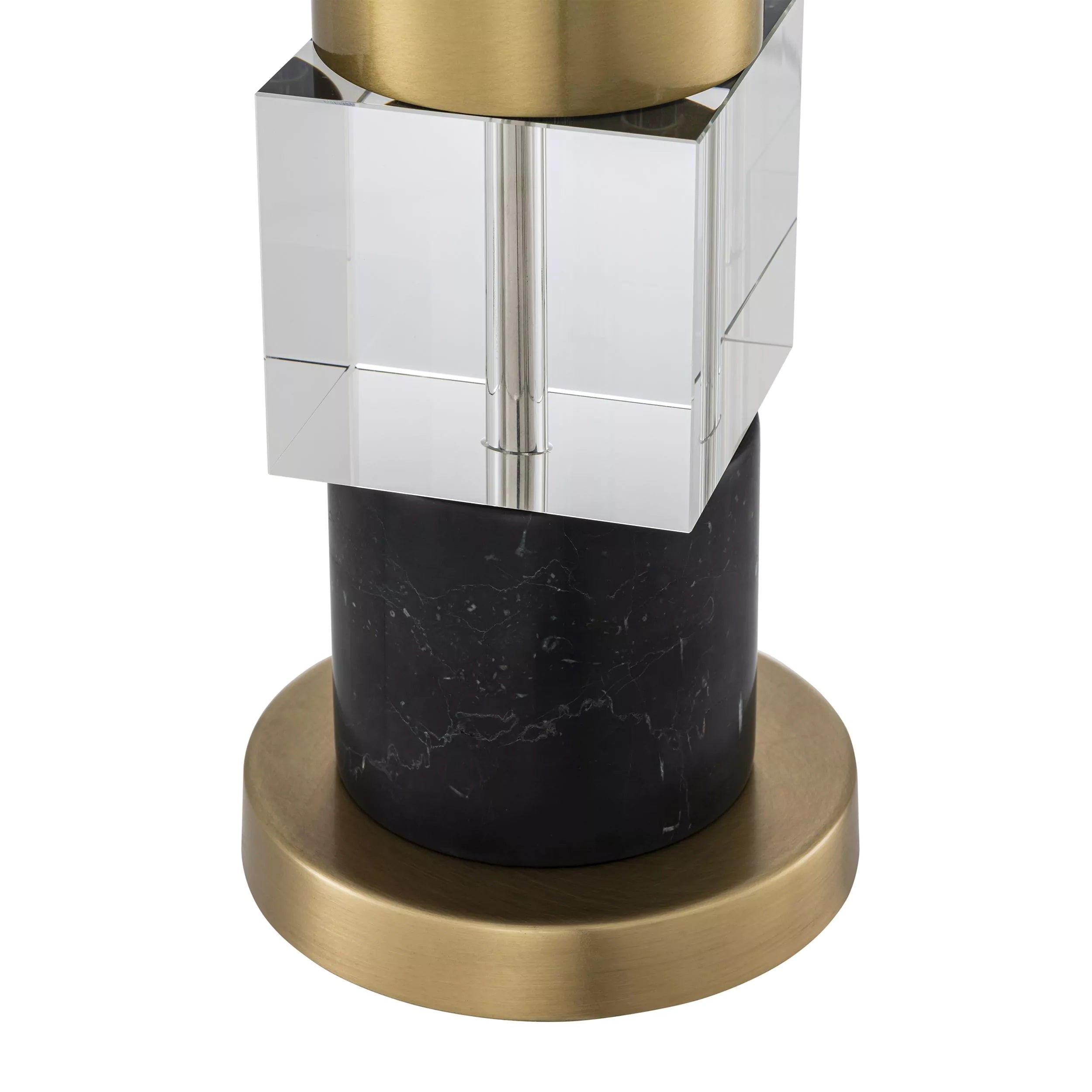 Podstawa Lampy stołowej Eichholtz Cullingham składa się z dwóch marmurowych cylindrów, dwóch kryształowych kostek i jednego cylindra wykończonego antycznym mosiądzem. Klosz wykonany jest z mieszanki lnu.