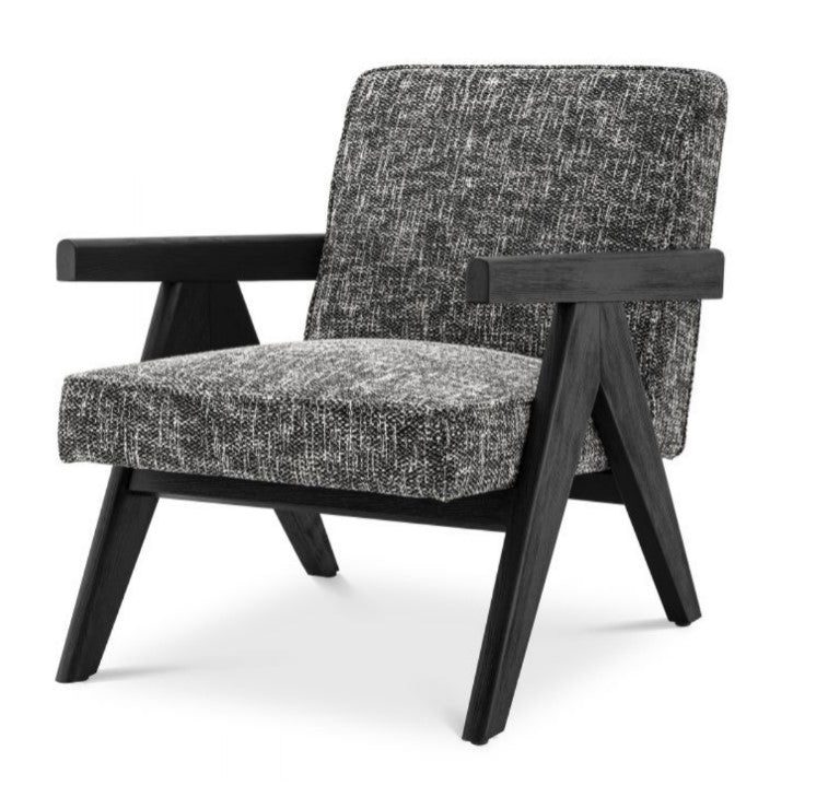Fotel Greta łączy w sobie styl vintage z najwyższym komfortem siedzenia. Wykonany z litego drewna z czarnym wykończeniem, ten piękny fotel ma nogi w kształcie litery V, charakterystyczne dla słynnych minimalistycznych projektów z lat 50. i 60. ubiegłego wieku. Siedzisko, oparcie i wyróżniające się podłokietniki są tapicerowane kremową tkaniną bouclé i wykończone lamówką.