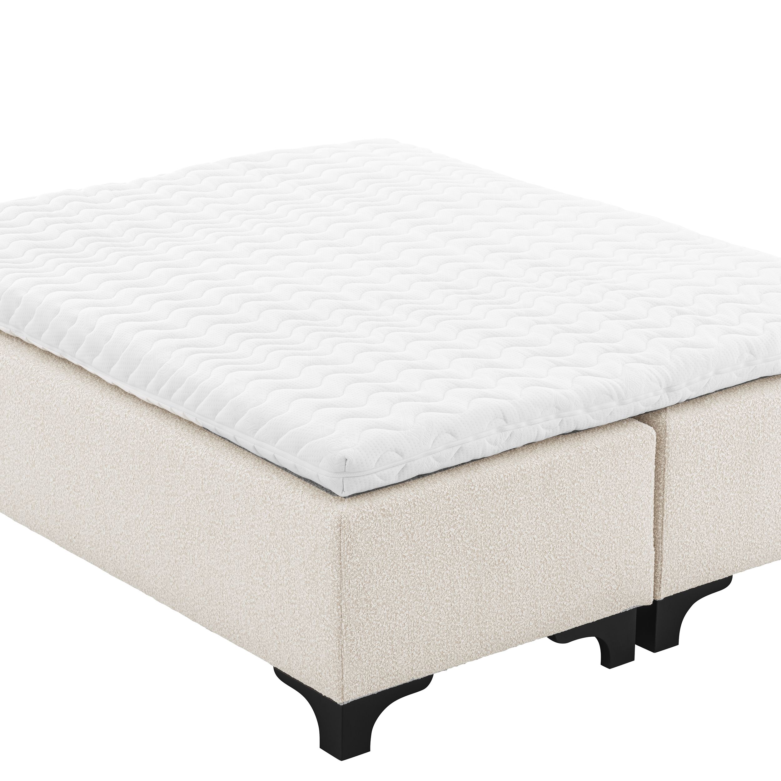 Wykonane z północnoeuropejskiego drewna iglastego, każda sprężyna skrzyniowa ma 4 nogi z litego drewna bukowego i jest wykończona miękką w dotyku kremową tkaniną Bouclé. Każdy element wspiera dwuwarstwowy materac kieszeniowy z 2 rodzajami hartowanych sprężyn stalowych. Piankowe części materaca różnią się gęstością dla zapewnienia najwyższego komfortu i mają otwartą strukturę komórkową dla optymalnej wentylacji.