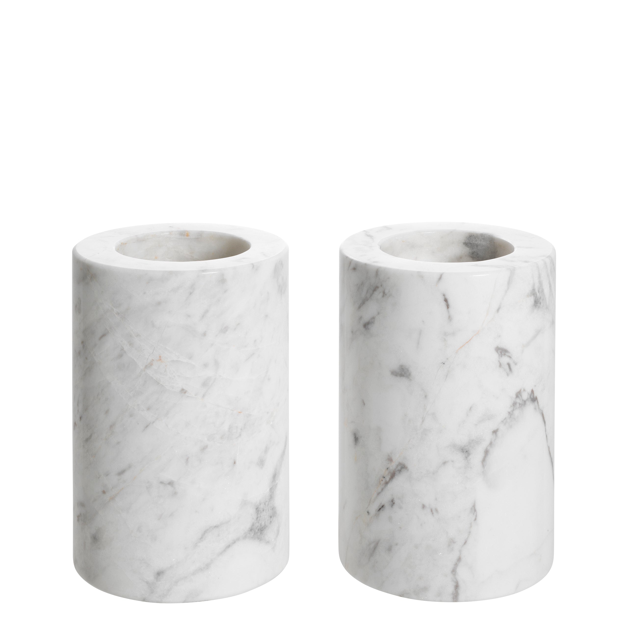 Prosty design 2-częściowego zestawu cylindrycznych świeczników na tealight Tobor S doda wyrafinowania Twojemu wystrojowi. Wykonane z białego marmuru z czarnymi żyłkami, te świeczniki na tealight idealnie pasują do różnych stylów wnętrz.